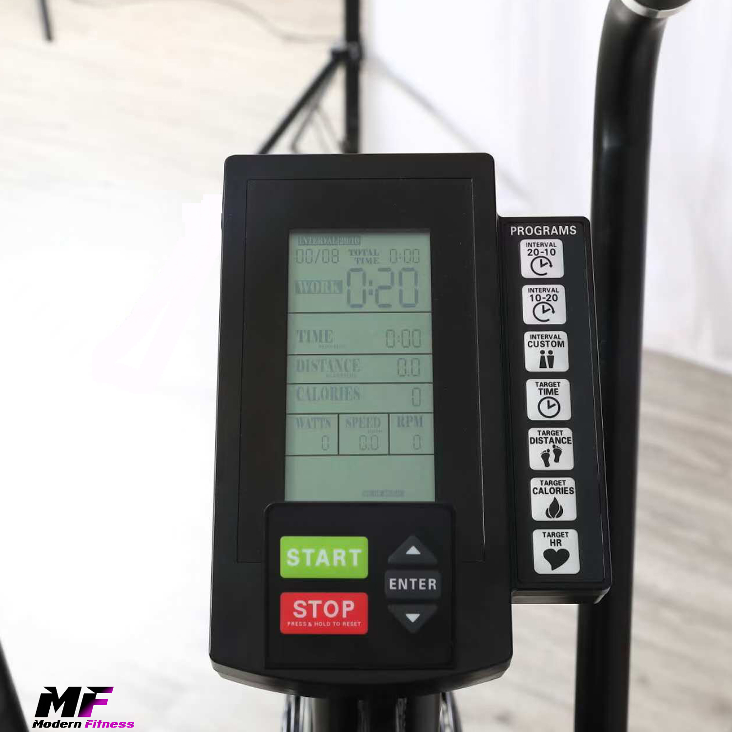 On-Board Computer: Crystal clear display showing time, distance, calories, watts, speed, RPM, and 6 preset training programmes