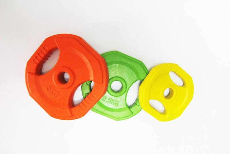 2 x 2.5kg plate weights (colour-coded, rubber-coated)