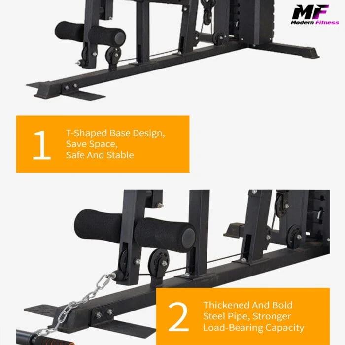 The Multigym Weight Training Machine is engineered for performance and durability. Built with a robust, high-grade steel frame and finished in striking black with bold red accents, it offers both style and substance. The T-shaped base ensures safety and stability, while thickened steel pipes and a 90mm steel pulley guarantee a strong load-bearing capacity and smooth operation.