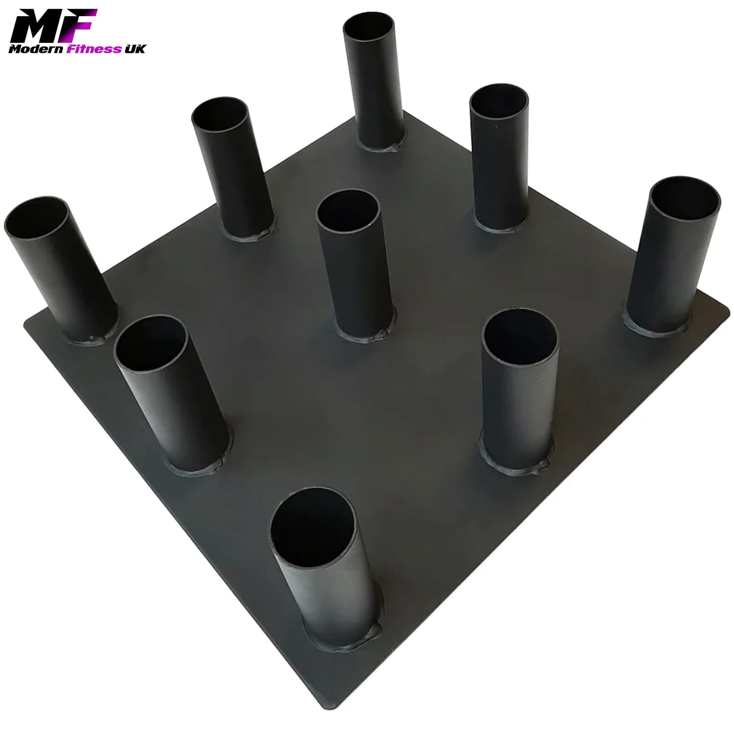 The 9 Hole Olympic Barbell Holder boasts a compact footprint of just 440mm x 440mm with a height of 210mm, taking up minimal floor space compared to traditional wall-mounted racks or horizontal storage. Its vertical design accommodates up to nine standard Olympic barbells with 50mm (2″) sleeves, ensuring easy access and efficient organisation.