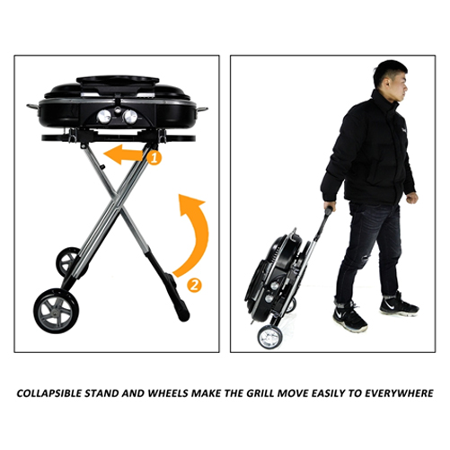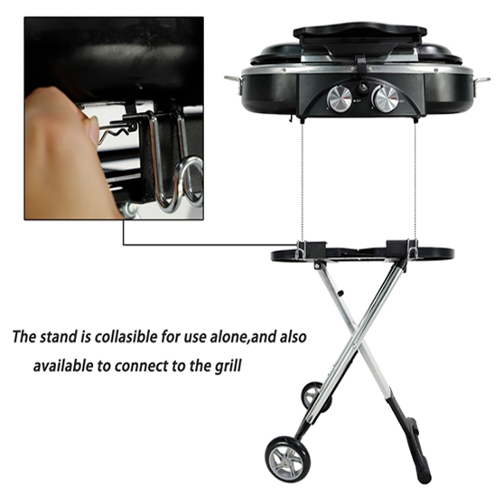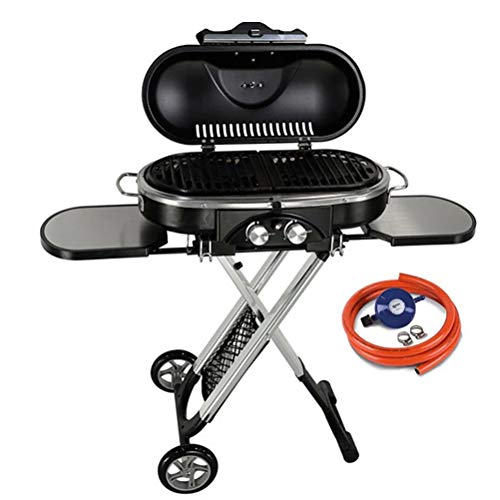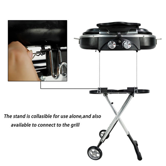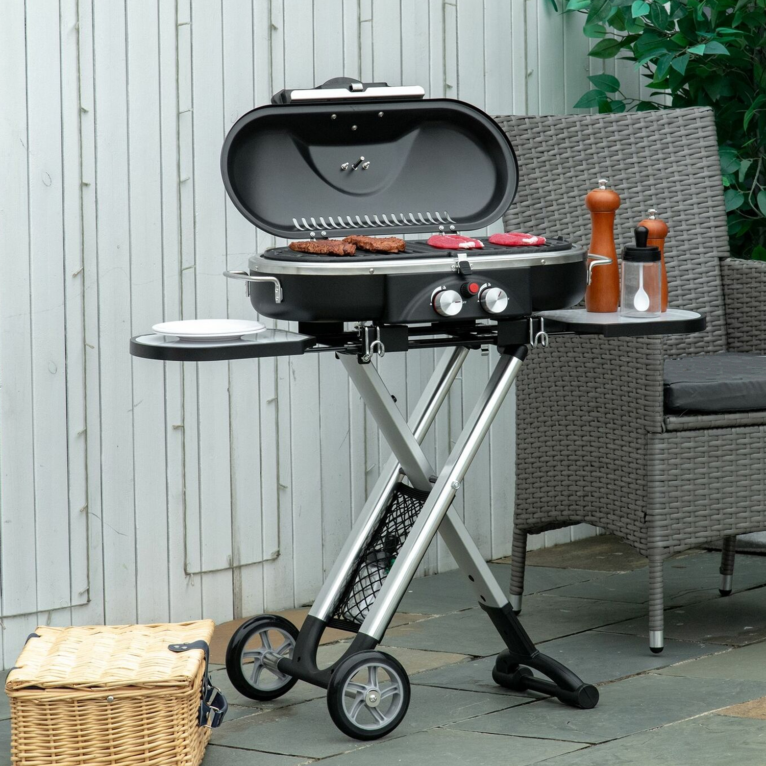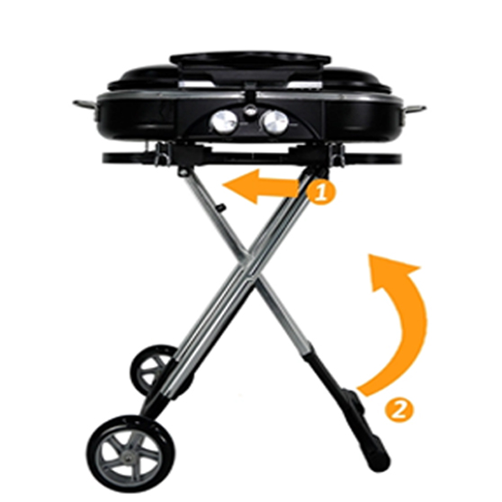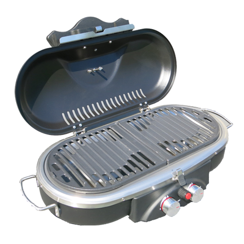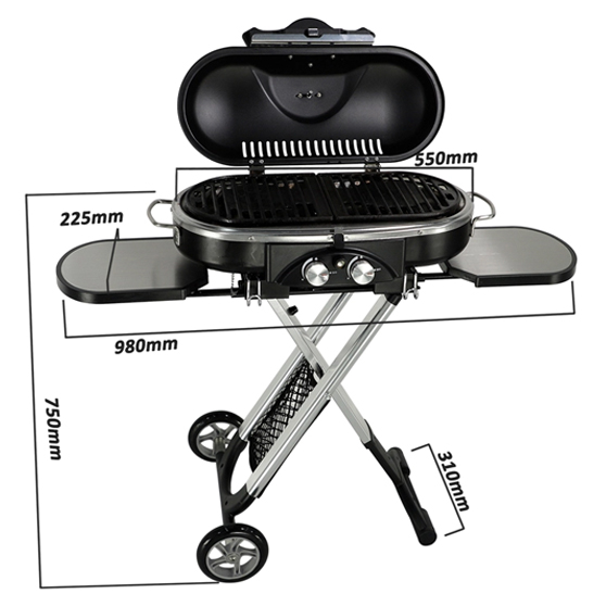 Perfect for outdoor cooking. This fantastic portable folding BBQ features two adjustable gas burners to create two different cooking areas – perfect for different types of meats, vegetables, breads and other food. Made from powder coated metal, and featuring solid metal cooking grills that are coated with an anti stick coating, this BBQ is strong and robust, with a cool-touch handle on the lid to open and close safely. Complete with a thermometer to observe the temperature when the lid is closed. This unique portable BBQ can also be easily detached from its stand to make it a table top BBQ and to make it more compact for storage and transport.